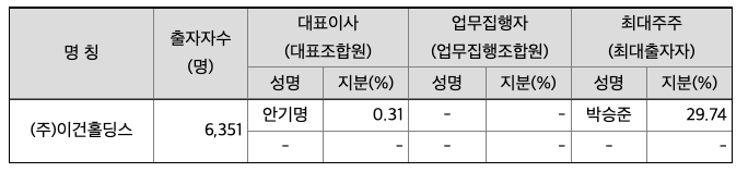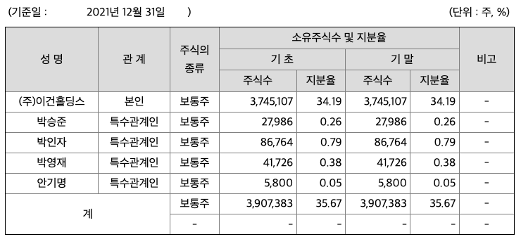 공시서류 작성기준일 현재 당사의 최대주주 (주)이건홀딩스는 그 특수관계인을 합하여 35.67%의 지분을 보유하고 있으며, 세부내역은 다음과 같습니다.