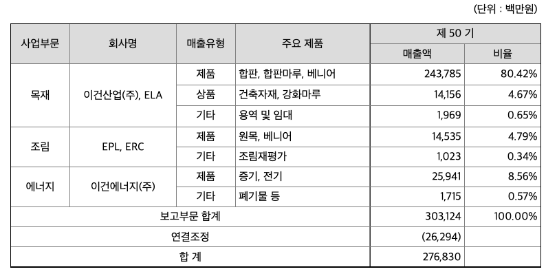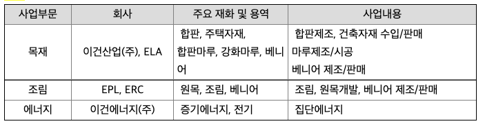 당사는 건축용 자재인 합판과 마루제품을 제조 및 판매, 목재 무역사업을 영위하는 목재종합건자재 전문회사이며 해외사업장으로는 솔로몬군도(EPL, ERC)와 칠레(ELA)가 있으며 바이오에너지사업을 영위하는 이건에너지(주)를 국내 주요 자회사로 두고 있습니다. 국내 합판 시장은 상대적으로 저가인 PB, MDF 등의 대체재의 비중이 높아지고 수입상품이 증가하면서 국내 기업들의 입지가 위축되고 있으며 동남아 등과 비교시 상대적으로 저렴한 인건비 및 원자재 가격 면에서 경쟁이 어려운 상황입니다. 다만 당사의 경우 해외의 칠레 및 솔로몬법인으로부터 비교적 낮은 가격으로 양질의 목재를 공급받고 있어 가격 및 조달 측면에서 경쟁력을 높이고 있으며 당사의 오랜 업력과 인지도를 통해 국내 시장지위는 안정적으로 유지하고 있습니다. 마루바닥재 시장은 친환경ㆍ고급화 경향으로 인하여 PVC소재 시장은 지속적으로 감소하는 추세이며, 합판마루와 강화마루가 PVC시장을 대체하면서 매우 빠르게 성장하였습니다. 2015년 즈음부터 등장한 강마루는 합판마루와 강화마루의 시장을 빠르게 대체하고 있으며, 비교적 가공이 까다롭고 고가인 목질 마루에서 목재를 정교하게 모방한 내구성과 가격 면에서 유리한 화학 계통의 신제품이 소비자의 선택을 받고 있습니다. 목질계 바닥재는 현재 성숙기에 진입하였으나, 마루바닥재가 도입된지 20년이 지난 현재도 상대적으로 고가인 원목마루의 시장규모는 성장하지 못하고 있으며 고급 주택에만 한정적으로 시공되고 있습니다. 향후 삶의 질이 개선될수록 원목마루 시장은 성장할 것으로 예상됩니다. 칠레 현지법인(ELA)은 합판, 베니어 제조 및 판매, 무역산업을 영위하며 안데스 산맥 등 현지에서 원목을 조달하고 있어 상대적으로 물류비용이 크지 않으며, 국내에 비해 상대적으로 낮은 인건비 등으로 인해 양호한 수익성을 보이고 있습니다. 또한, 칠레가 다수의 국가와 FTA를 체결하고 있어 국내에 비해 무역장벽이 낮아 수출판매에도 유리한 영업환경을 지니고 있어 미국, 멕시코, 유럽, 남미 등 다양한 판매시장을 가지고 있습니다. 1995년 솔로몬 해외조림을 시작한 솔로몬 법인은 현재까지, 끊임없는 육종개발 및 연구를 통해서 우수하고 경쟁력 있는 목재자원의 조림을 성공적으로 진행하였으며, 국내 목재 업체중 최초로 해외조림이 결실을 맺는 단계에 이르렀습니다. 향후 그동안 축적된 조림 노하우를 바탕으로 해외조림사업을 기업의 핵심사업으로 육성, 성장시켜 나갈 계획입니다. 솔로몬 법인에서 생산되는 원목은 당사는 중계무역을 통해 수출하며 베니어 공장을 통해 낮은 가격의 원재료를 공급받고 있습니다. 열병합 발전사업은 전기와 열을 동시에 생산하여 에너지 효율을 극대화하고, 그로 인한 에너지 절감 및 환경개선을 실현시키는 미래 지향적 에너지 사업입니다. 동일한 연료를 사용하여 두가지 유형이 다른 에너지(열 및 전기)를 동시에 생산하는 것으로, 증기 터빈으로 발전기를 구동해 전기를 생산하고 구동기에서 발생하는 열을 회수하는 방법입니다. 타 발전방식의 경우 투입에너지의 1/3만 전력으로 생산되고 나머지 2/3의 에너지는 버려지나, 열병합 발전방식의 경우 버려지는 손실열을 회수하여 냉/난방의 열원으로 사용합니다. 열병합발전으로 생산된 에너지를 계열사 및 인근회사의 공장, 한국전력거래소 등에 판매하고 있으며, 장기공급계약체결을 통해 안정적인 매출을 유지하고 있습니다.