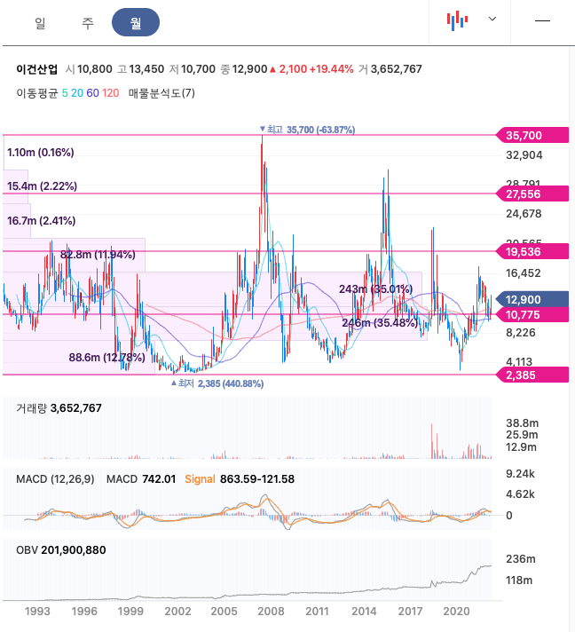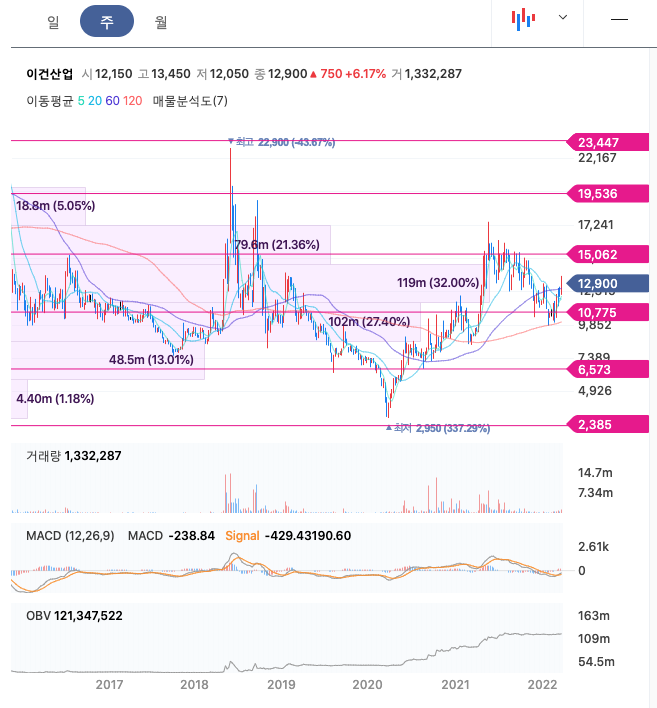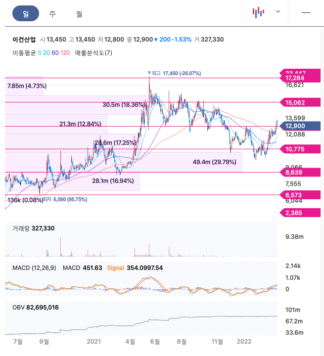 이건산업의 주가는 21년 4월 급등하여 21년 5월 최고 17,450원을 찍고 조정을 받았습니다.