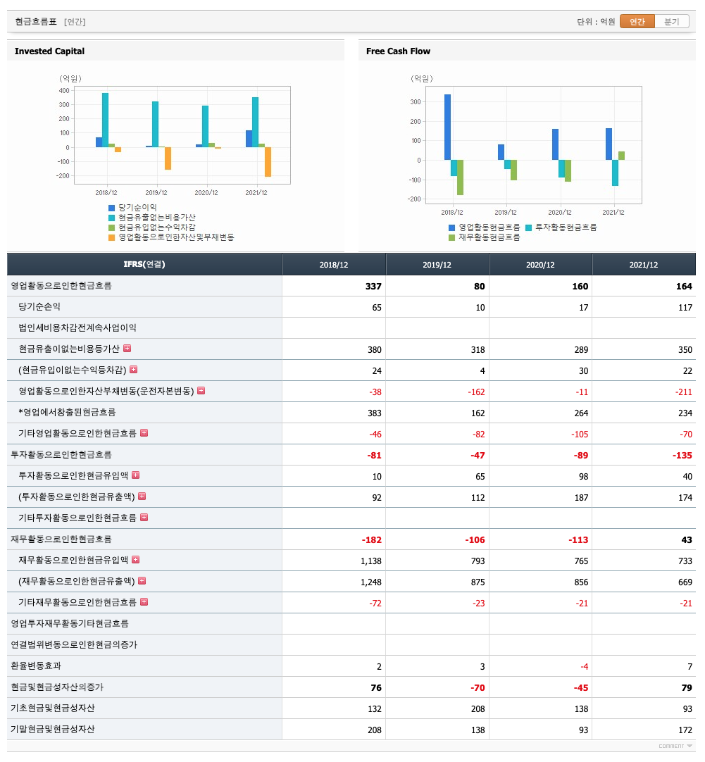 영업활동 현금흐름 : 2018년 337억원, 2019년 80억원, 2020년 160억원, 2021년 1,2,3분기 164억원으로 영업활동 현금흐름이 원활합니다.