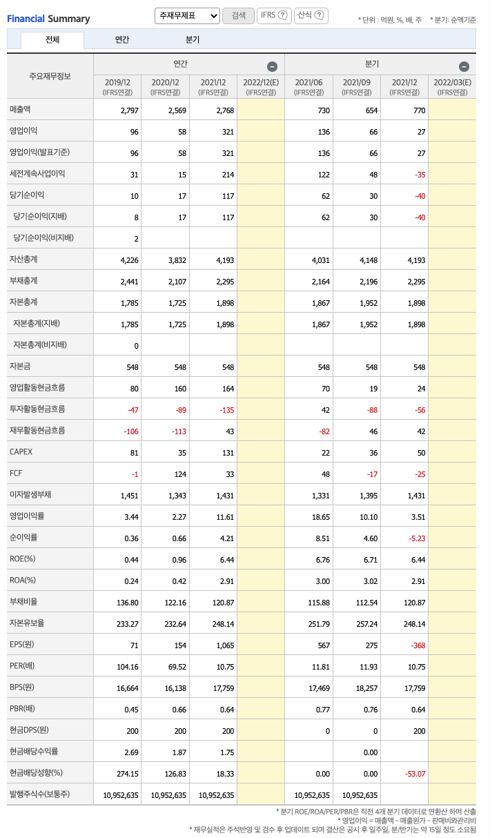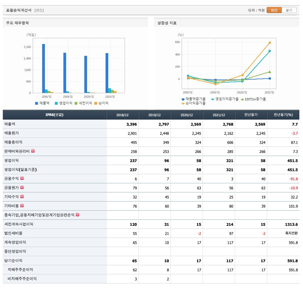 매출액 : 2018년 3396억원, 2019년 2797억원, 2020년 2569억원, 2021년 1,2,3분기 2768억원으로 전년동기대비 증가하였습니다. 2021년 3분기는 전년동기대비 7.7% 증가하였습니다. 2020년 분기별로 보면 4분기 614억원, 2021년 1분기 730억원, 2분기 654억원, 3분기 770억원입니다.