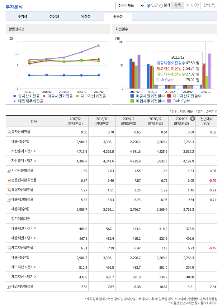 **매출채권회전일수(=돈을 받는 순환일 수, 낮을 수록 좋습니다) 약 47일, 재고자산회전일수(=재고자산 빠지는 일수, 높을 수록 좋습니다) 약 54일, 매입채무회전일수(=돈을 늦게 줘도 되는 일 수, 높을 수록 좋습니다) 약 27일이고, Cash Cycle(현금회전율, 낮을 수록 좋습니다) 약 75일로 현금운영입니다.