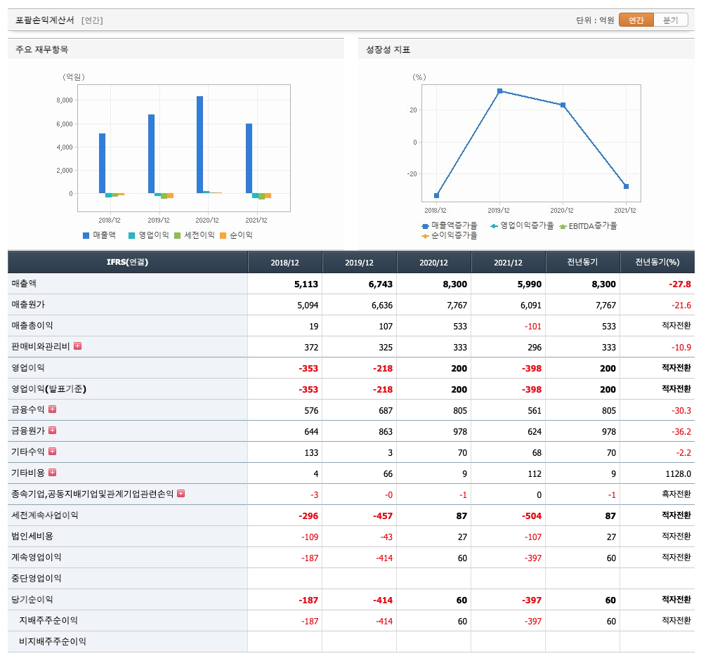 매출액 : 2018년 5113억원, 2019년 6743억원, 2020년 8300억원, 2021년 1,2,3분기 5990억원으로 전년동기대비 감소하였습니다. 2021년 3분기는 전년동기대비 -27.8% 감소하였습니다. 2020년 분기별로 보면 4분기 1145억원, 2021년 1분기 1701억원, 2분기 1186억원, 3분기 1834억원입니다.