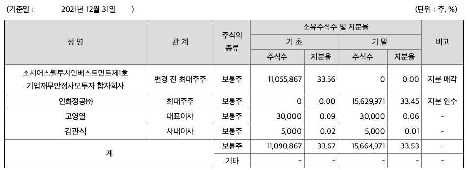 당사의 당기말 현재 최대주주는 인화정공(주)이며, 총 33.45%를 보유하고 있습니다.