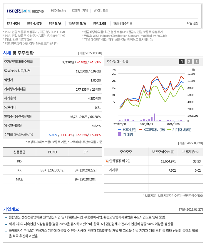 HSD엔진의 주가는 21년 3월 반등하여 5월 최고 12,250원을 찍고 조정을 받았습니다.