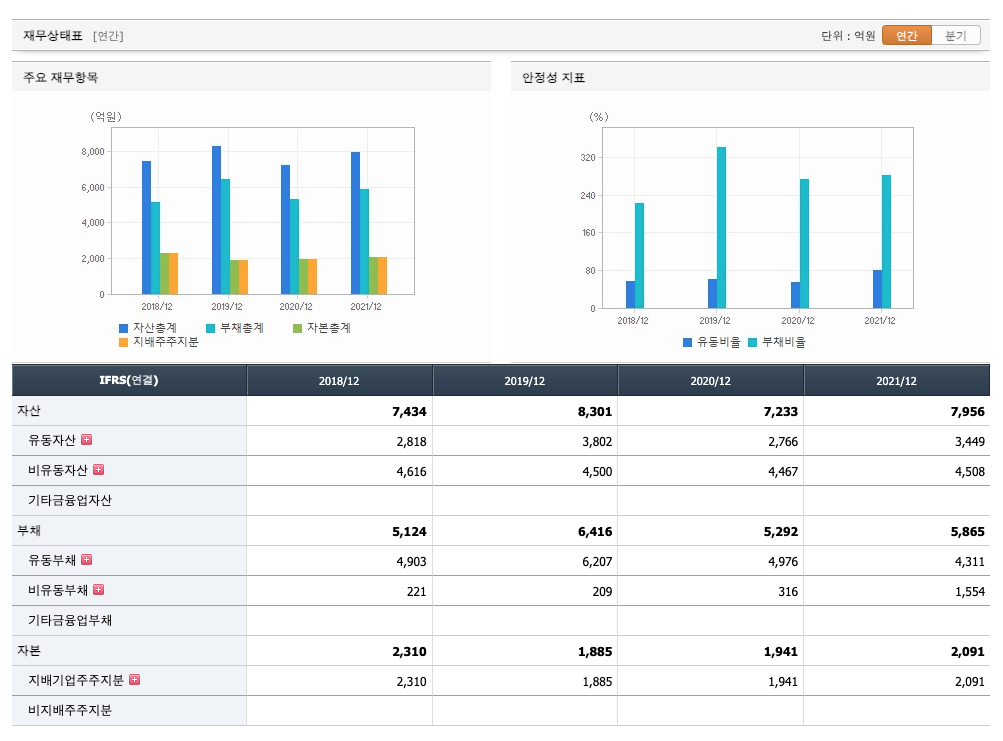 영업활동 현금흐름 : 2018년 184억원, 2019년 -647억원, 2020년 838억원, 2021년 -458억원으로 2018년과 2020년의 영업활동 현금흐름이 원활합니다.