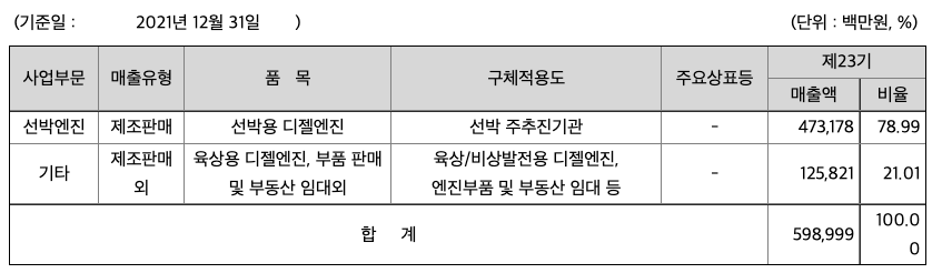 당사는 조선 산업의 핵심 기자재인 대형 선박용 엔진 제작을 중심으로 엔진 부품의 판매와 서비스를 제공하고 있으며, 디젤엔진을 이용한 발전시설을 공급하는 종합 엔진메이커입니다. 단기간에 누계 저속엔진 생산 1억마력을 달성하였으며, 2014년 세계 최초 선박용 이중연료(DF) 엔진 상용화 및 독자 기술로 친환경 탈질시스템(DelNOx)을 개발하는 등 기술개발을 선도하고 있습니다.