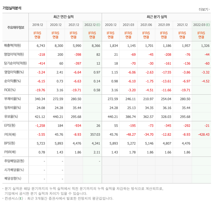 영업이익 : 2018년 -353억원, 2019년 -218억원, 2020년 200억원, 2021년 1,2,3분기 -398억원으로 전년동기대비 적자전환하였습니다. 2020년 분기별로 보면 4분기 -69억원, 2021년 1분기 -45억원, 2분기 -208억원, 3분기 -76억원입니다.