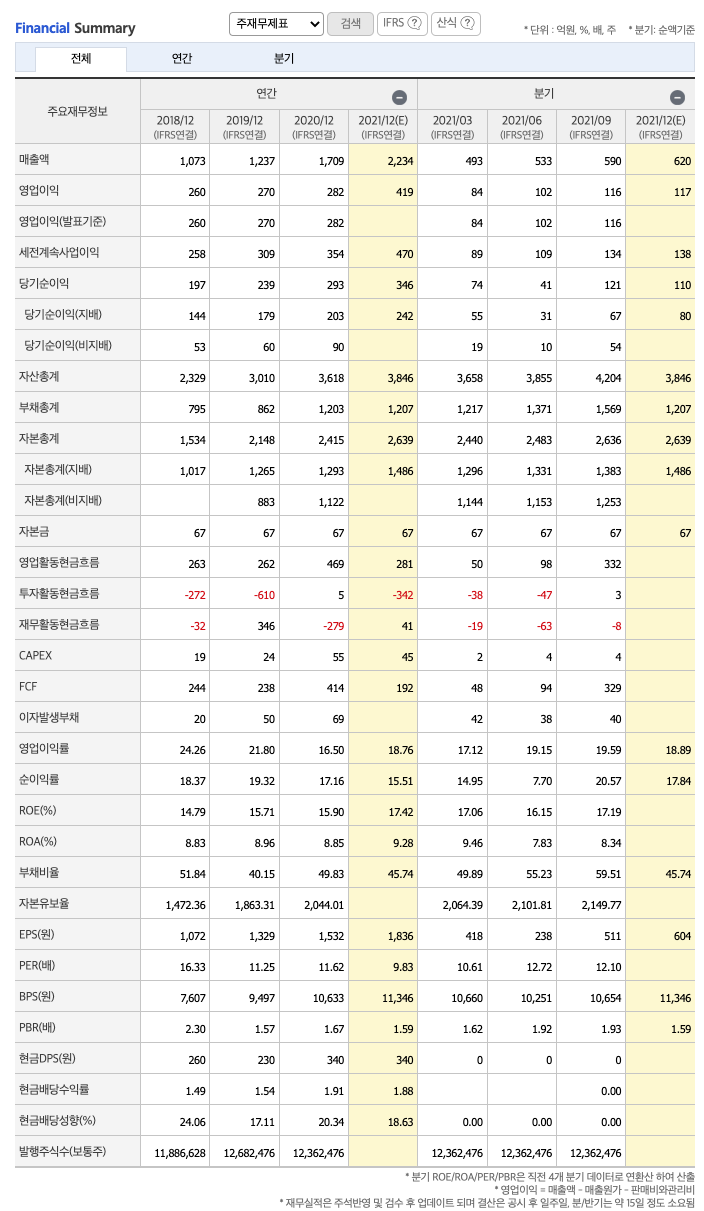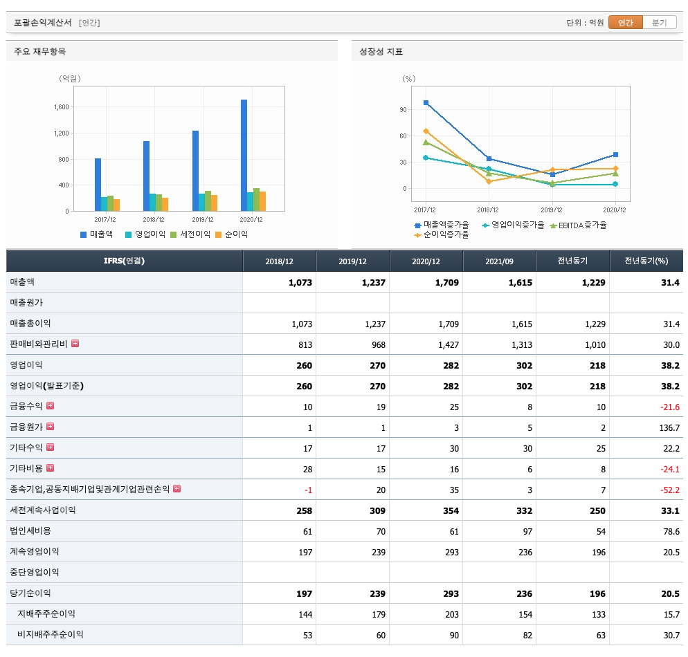 매출액 : 2018년 1073억원, 2019년 1237억원, 2020년 1709억원, 2021년 1615억원으로 전년동기대비 증가하였습니다. 2021년는 전년동기대비 31.4% 증가하였습니다. 2021년 분기별로 보면 1분기 480억원, 2분기 493억원, 3분기 533억원, 4분기 590억원입니다.