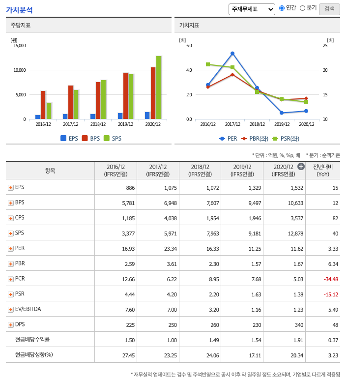 DPS(Dividend Per Share의 약자, 총배당금을 총주식발생수로 나눈 것, 한 주당 얼만큼의 배당금을 받을 수 있는지 알 수 있는 지표, DPS가 높을 수록 배당금이 많은 것임) : 2017년 250원, 2018년 260원, 2019년 230원, 2020년 340원으로 전년동기 증가하였습니다.