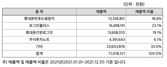당사는 개인정보보안 중심의 2차 본인인증 및 보안서비스와 다양한 생활서비스를 개발 및 운영하는 것을 주된 사업으로 하고 있으며 이동통신사 부가서비스 형태로 주된 매출이 발생합니다. 2009년 휴대폰번호도용방지 서비스를 시작으로 로그인플러스, 휴대폰간편로그인 등의 다양한 2차 본인인증 및 보안서비스를 제공하고 있으며 주식투자노트, 건강지키미, 세이프캐시, 내정보지키미 등을 서비스하며 생활 플랫폼으로 사업영역을 확대하고 있습니다. 특히 시장 개척 역량, 서비스 개발 역량, 가입자 기반의 인프라 등을 바탕으로 다양한 IT서비스에 대한 퍼블리싱 사업과 1차 본인인증 운영까지 사업영역을 확대하는 것은 물론 강력한 마케팅 역량을 바탕으로 독점적인 IT서비스 비즈니스 플랫폼을 구축하고 있습니다.