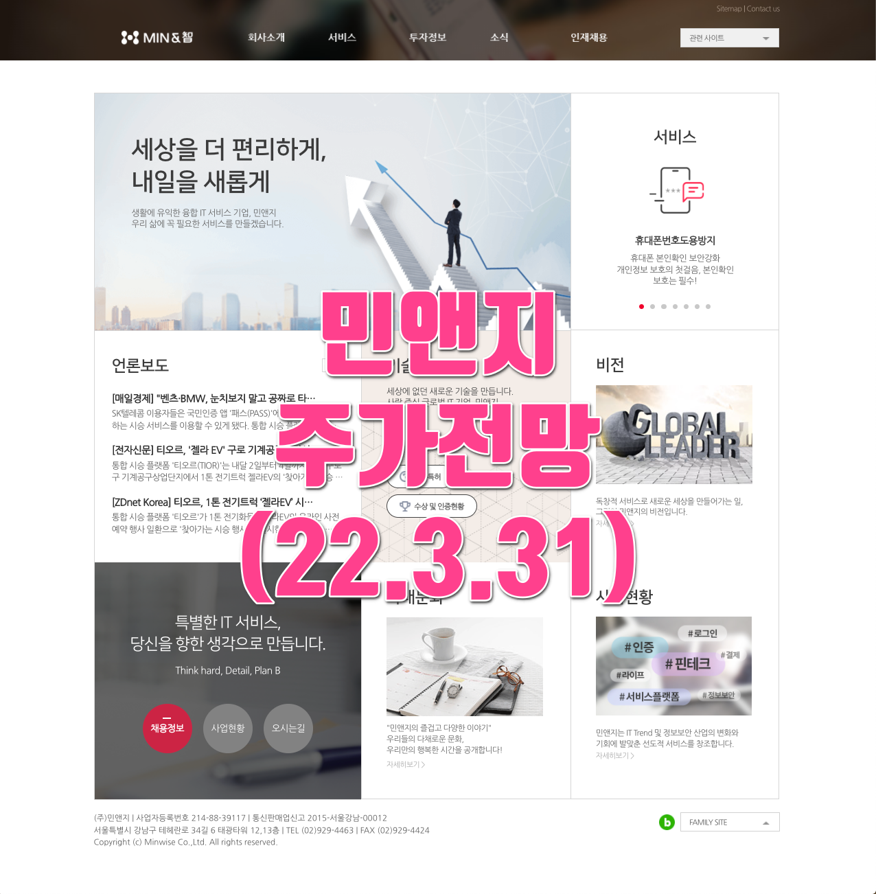당신이 꼭 찾던IT 서비스 우리가 원하던 IT 서비스 세상이 민앤지의 독창적 사고방식으로 시작됩니다. 세상을 더 편리하게,내일을 새롭게 생활에 유익한 융합 IT 서비스 기업, 민앤지 우리 삶에