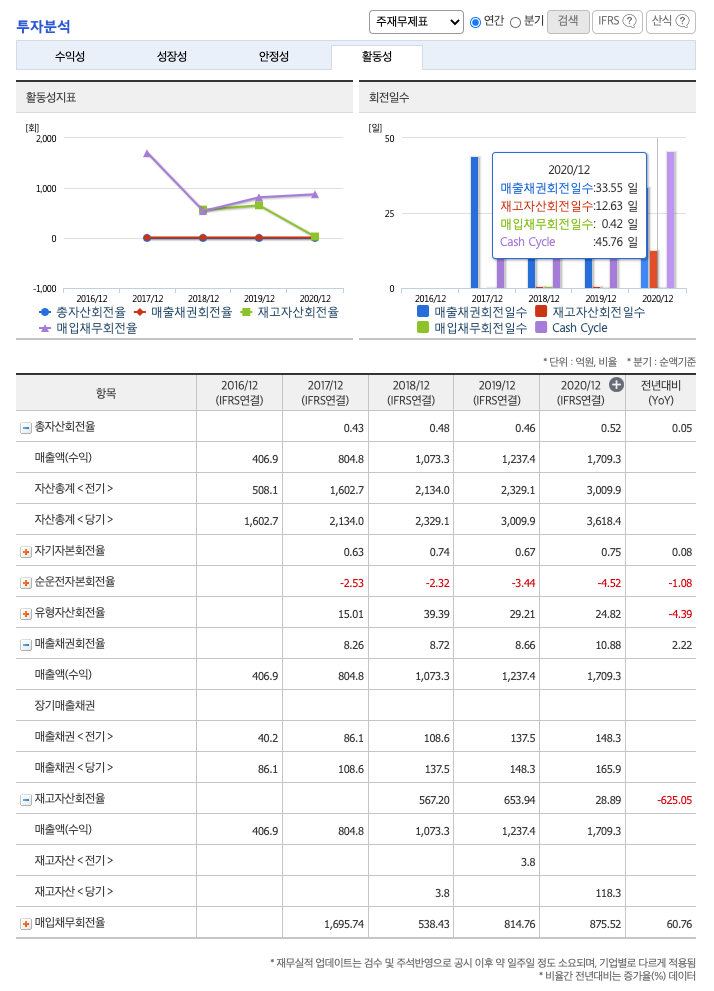 재고자산회전율(높을 수록 좋습니다) : 2018년 약 3억원, 2020년 약 118억원이고, 회전율은 2019년 약 567%, 2020년 약 653%, 2021년 약 28%로 안정적입니다.