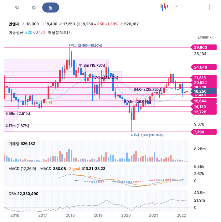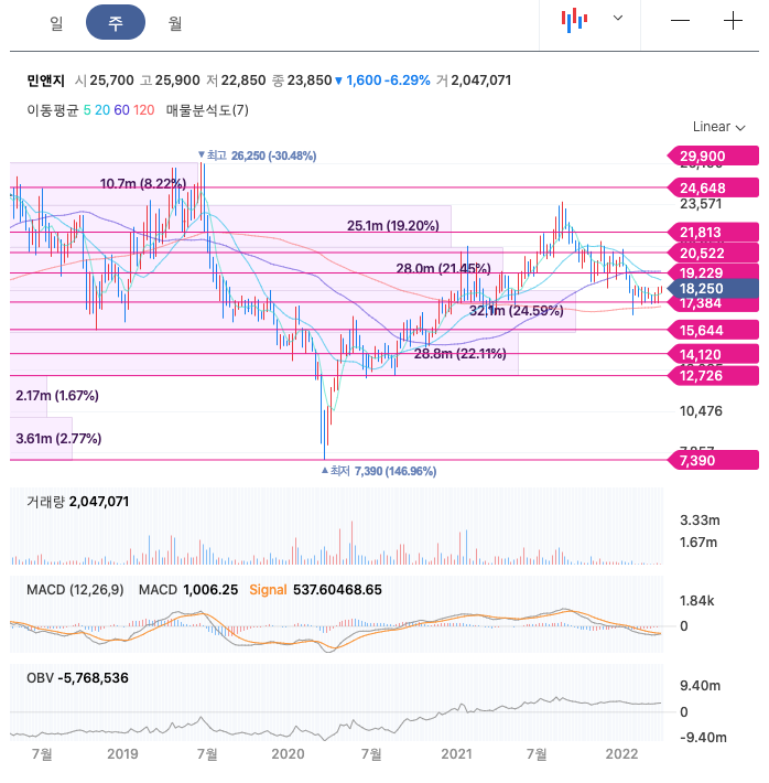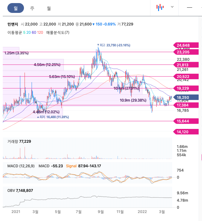 민앤지의 주가는 21년 4월에 반등하여 21년 8월 최고 23,750원을 찍고 조정을 받았습니다.