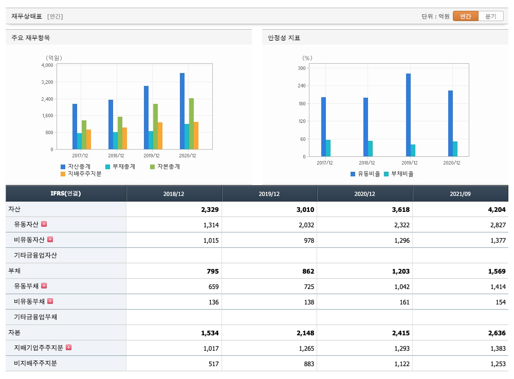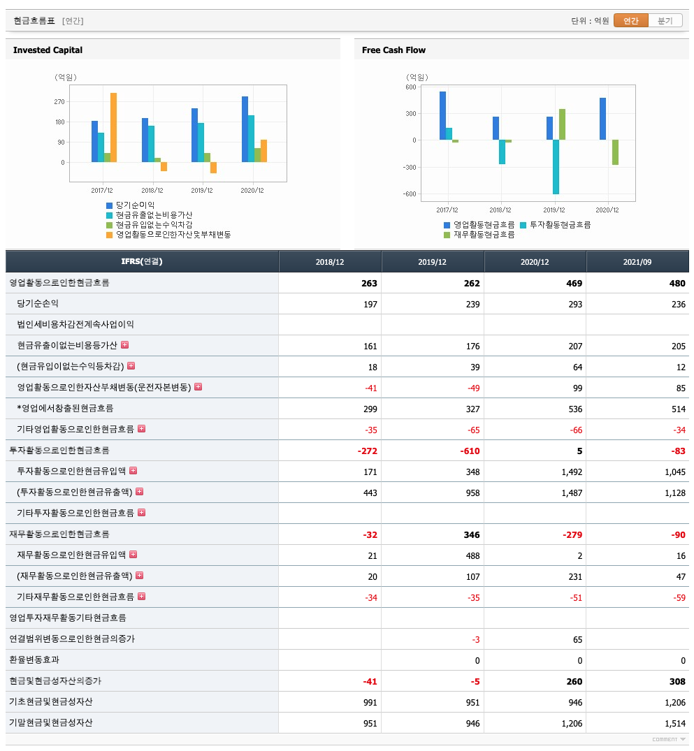 영업활동 현금흐름 : 2018년 263억원, 2019년 262억원, 2020년 469억원, 2021년 480억원으로 영업활동 현금흐름이 원활합니다.