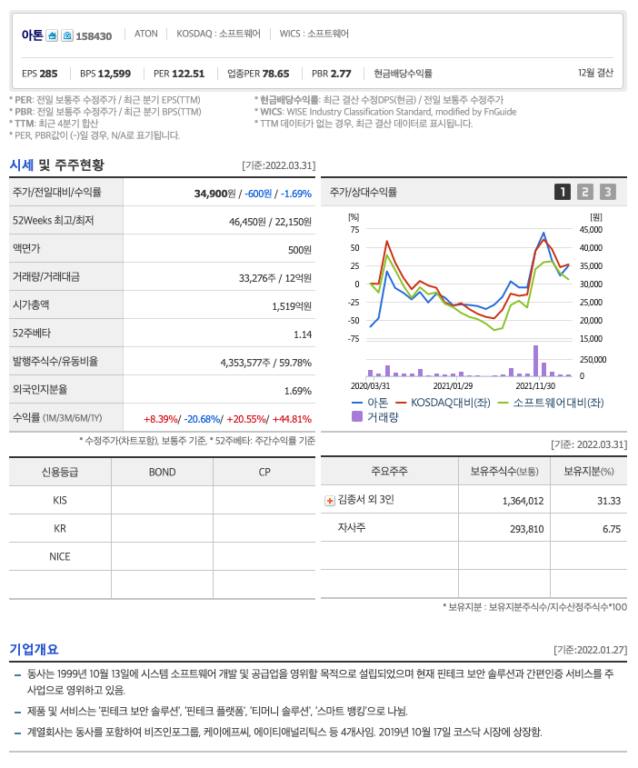 아톤의 2022년 영업이익은 126억원으로 추정됩니다. 현재(22. 4. 1) 시가총액은 1519억원으로 멀티플 12입니다.
