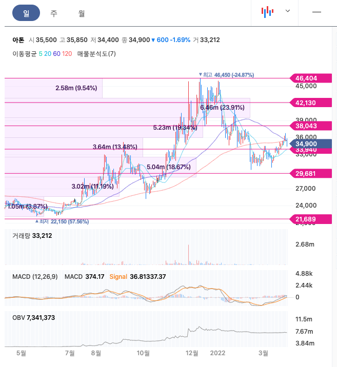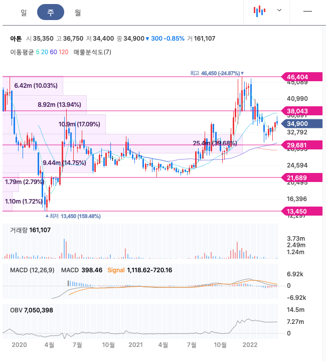 아톤의 주가는 21년 6월 반등하여 21년 12월 최고 46,450원을 찍고 조정을 받았습니다.