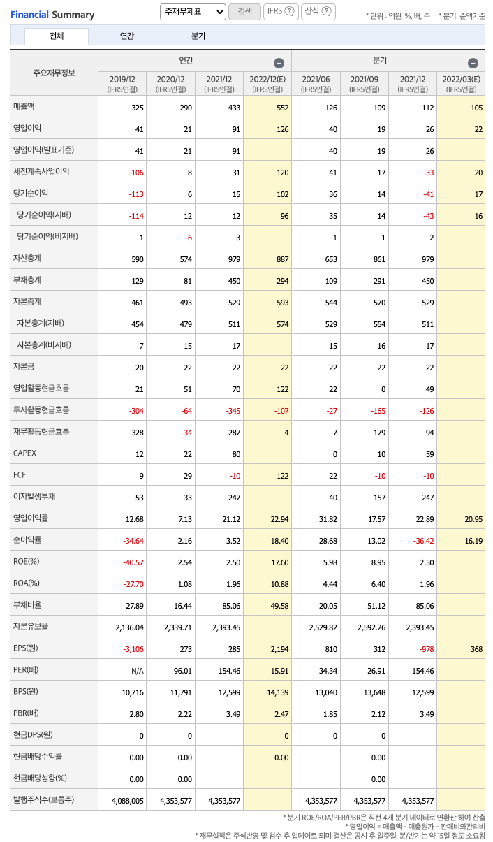 FCF(미래현금흐름) : 2019년 9억원, 2020년 29억원, 2021년 -10억원으로 CAPEX가 2019년과 2020년은 좋습니다. 2022년은 122억원으로 추정됩니다.