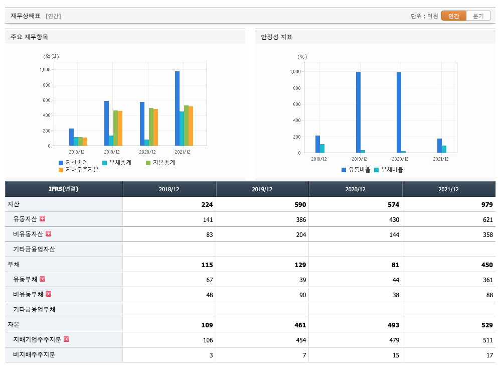 자산은 2018년 224억원, 2019년 590억원, 2020년 574억원, 2021년 979억원으로 증가하였습니다.