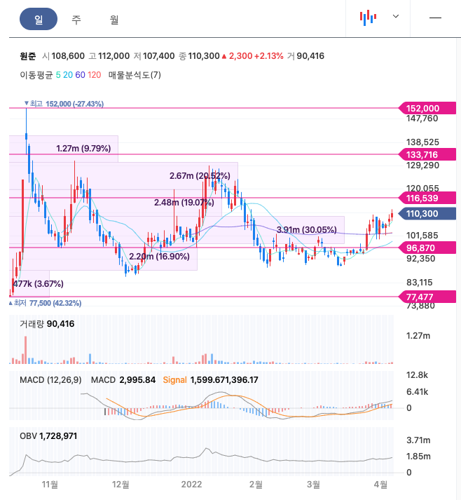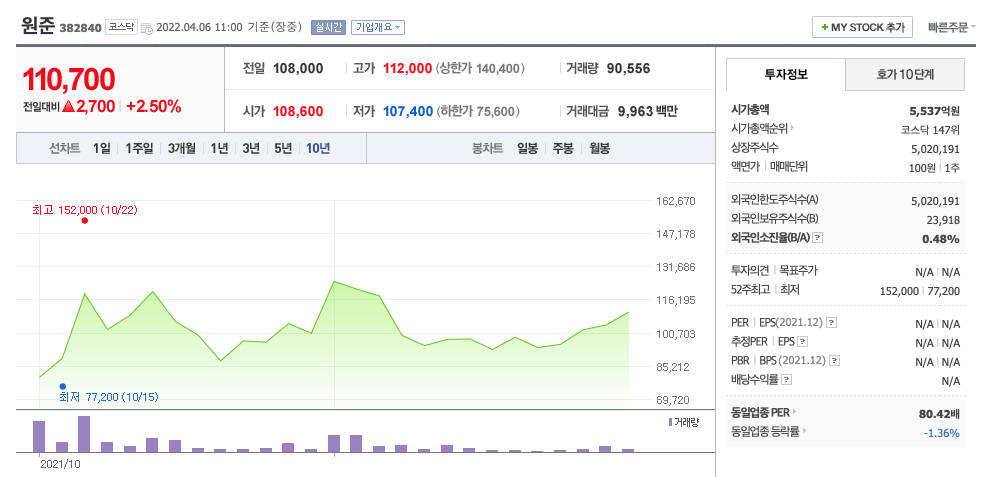 원준의 주가는 21년 10월 최고 152,000원을 찍고 조정을 받았습니다.
