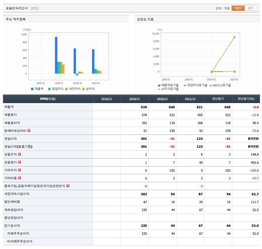 매출액 : 2019년 929억원, 2020년 640억원, 2021년 621억원으로 전년동기대비 감소하였습니다. 2021년는 전년동기대비 -3% 감소하였습니다.