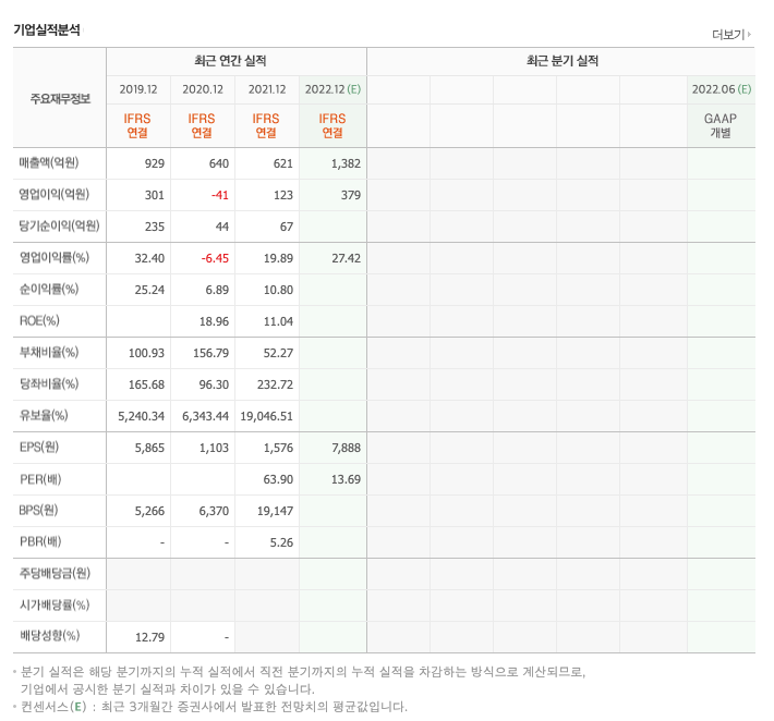 유보율 : 2019년 약 5240%, 2020년 약 6343%, 2021년 약 19,046%로 증가하고 있으며, 표준(100%)보다 높아 부채비율이 안정적입니다.