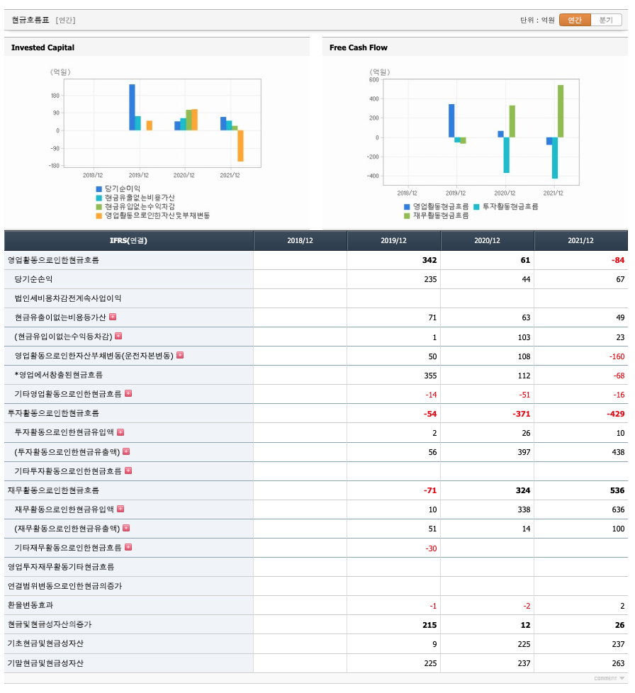 영업활동 현금흐름 : 2019년 342억원, 2020년 61억원, 2021년 -84억원으로 2019년고 2020년의 영업활동 현금흐름이 원활합니다.