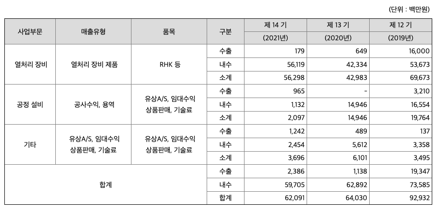 현재 당사는 각종 첨단소재 생산을 위해 필수적으로 필요한 열처리 소성로 장비를 제조 및 판매하는 사업과 소재의 생산 공정에 대한 EPC(Engineering Procurement Construction) Turn Key 솔루션을 제공하는 공정설비 엔지니어링 사업을 영위하고 있습니다.