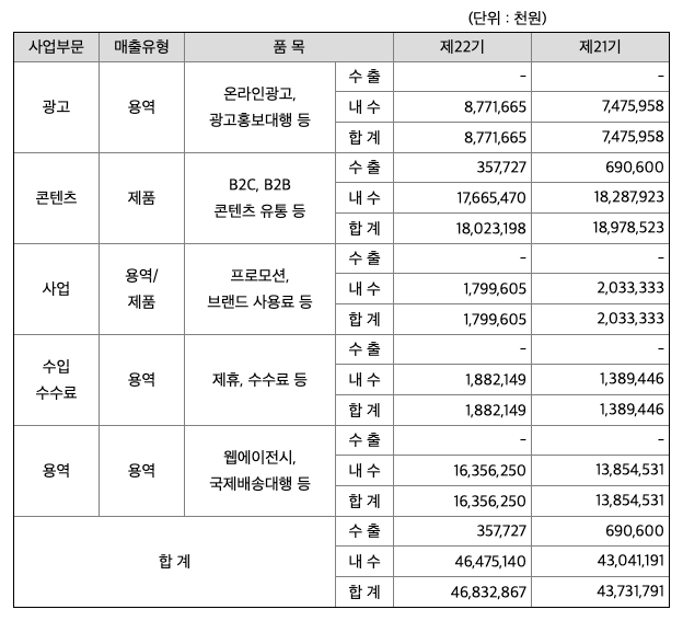 당사의 주요사업은 MBC그룹의 대표 사이트인 www.imbc.com을 기반으로 방송콘텐츠 및 당사 자체 제작 콘텐츠 등의 디지털콘텐츠를 유ㆍ무료 서비스하고, 유통하고 있습니다. 단순한 방송콘텐츠의 다시보기를 넘어 다양한 부가콘텐츠를 제작하고, MBC그룹의 시청자와 네티즌의 커뮤니케이션 채널로서의 역할을 담당하고 있습니다. 또한, 서비스 이용자를 대상으로 드라마, 예능, 라디오, 연예뉴스 등의 콘텐츠와 연계된 온라인 광고사업, 프로모션 사업 등을 운영하고 있으며, 자체제작 콘텐츠 공급 확대 및 서비스 강화에도 노력하고 있습니다. 한편, 종속회사인 아이포터는 고객이 해외 쇼핑몰에서 주문한 상품을 해외 배송부터 통관까지 대행해 주는 국제배송대행 사업을 진행하고 있습니다.
