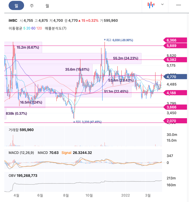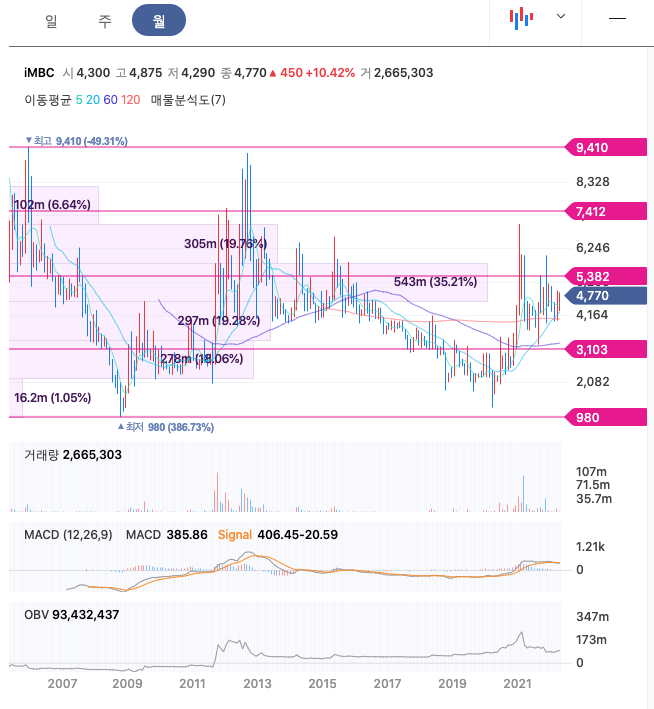 iMBC의 주가는 20년 11월 급등하여 21년 1월 최고 7,010원을 찍고 조정을 받았습니다.
