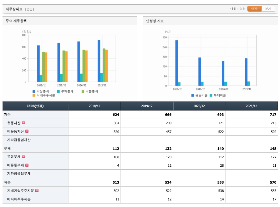 자산은 2018년 624억원, 2019년 666억원, 2020년 693억원, 2021년 717억원으로 증가하였습니다.