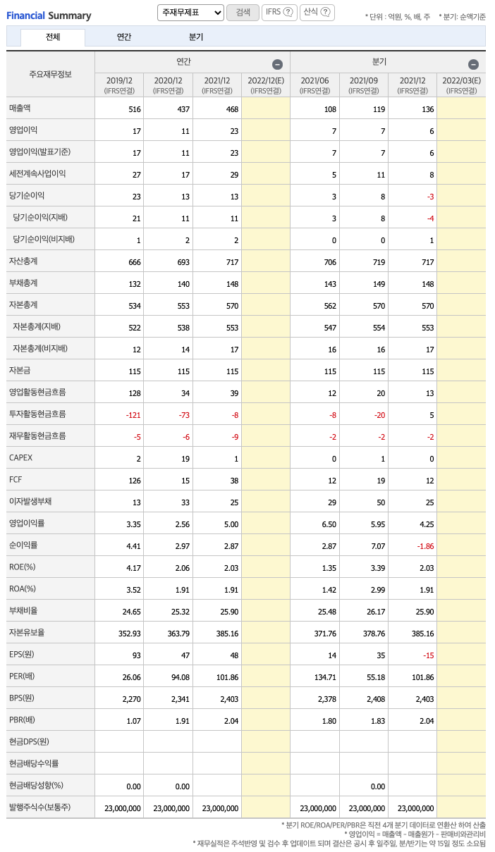 매출액 : 2018년 581억원, 2019년 516억원, 2020년 437억원, 2021년 468억원으로 전년동기대비 증가하였습니다. 2021년는 전년동기대비 7.1% 증가하였습니다. 2021년 분기별로 보면 1분기 106억원, 2분기 108억원, 3분기 119억원, 4분기 136억원입니다.