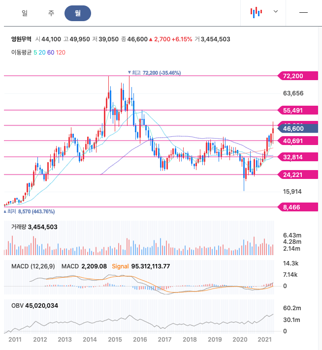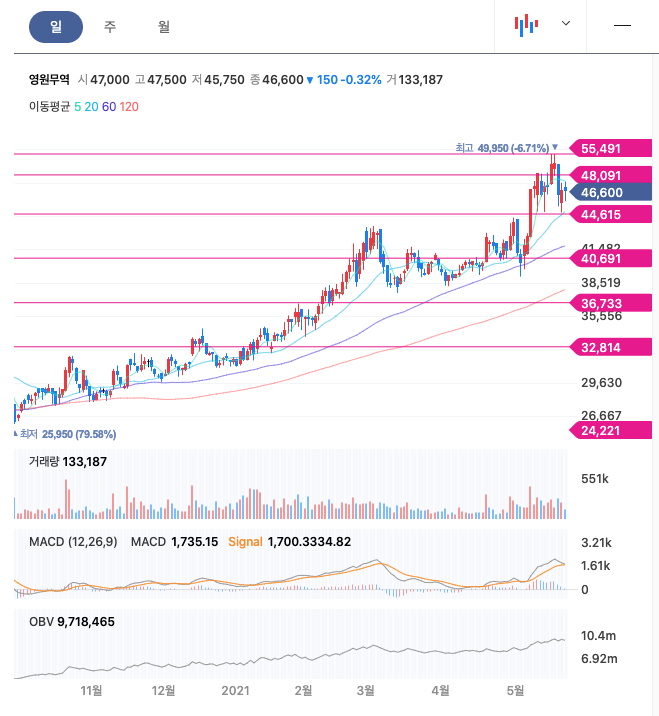 영원무역은 21년 1월부터 지속적으로 우상향하였고, 이후 21년 3월~4월 횡보하다가 4월이후 급등하여 최고점 49,950원을 찍고 조정을 받고 있습니다.