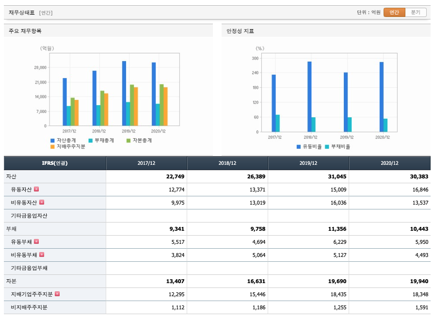 부채비율 : 2018년 약 58%, 2019년 약 57%, 2020년 약 52%로 감소하고 있으며, 표준(100%)보다 낮아 부채비율이 안정적입니다.