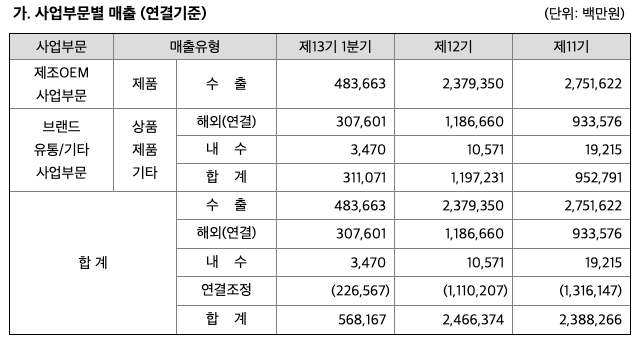 -1분기, 계절적 비수기에도 불구 매출 성장 대비 수익성 크게 개선되며 시장 컨센서스 상회하는 호실적 기록. OEM부문 대비 브랜드 부문의 수익성 개선 효과가 주효. 자회사 Scott과 기타 브랜 드 판매 호조 분위기 지속되고 있는 것으로 파악되는 가운데 OEM 매출 또한 분기비 개선 전망 되어 상반기 실적 호조 지속될 전망. 하반기 OEM 부문 수주 성장 본격화될 것으로 예상