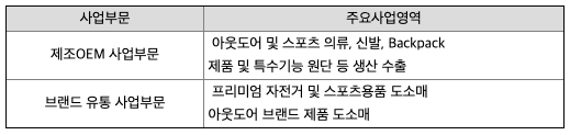 영원무역 지배회사는 국내 본사를 비롯하여 해외현지법인 생산공장과 원자재 조달 회사, 아웃도어 및 스포츠 브랜드 회사 등 총 69개의 동종 및 유사 업종을 영위하는 종속회사로 구성된 글로벌 아웃도어 및 스포츠 기업 입니다. 영원무역 및 종속회사의 사업부문은 아웃도어 및 스포츠 의류, 신발, Backpack 제품과 특수기능 원단 등을 생산 수출하는 제조 OEM 사업부와, 아웃도어 브랜드 제품과 프리미엄 자전거 및 스포츠용품 유통업을 영위하는 브랜드 유통 및 기타 사업부로 구성되어 있습니다.