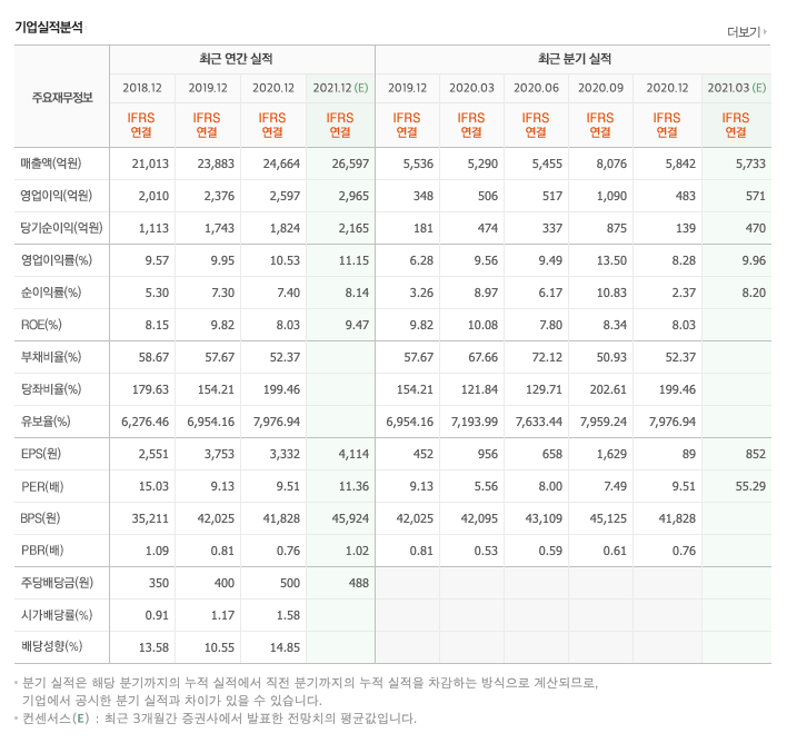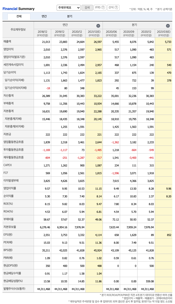 FCF(미래현금흐름) : 2018년 569억원, 2019년 1056억원, 2020년 2561억원으로 미래현금흐름이 좋습니다. 2021년은 1815억원으로 추정됩니다.