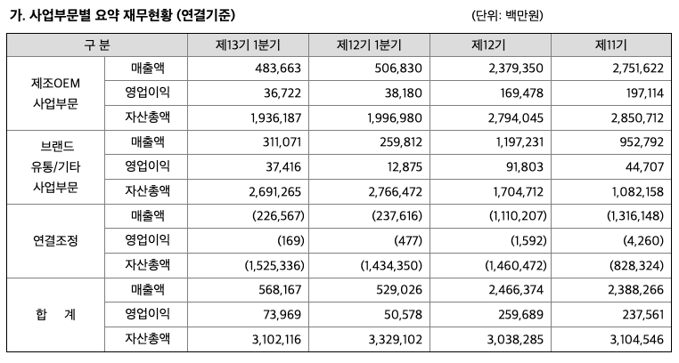 **사업부문별 요약 재무 현황(연결기준)