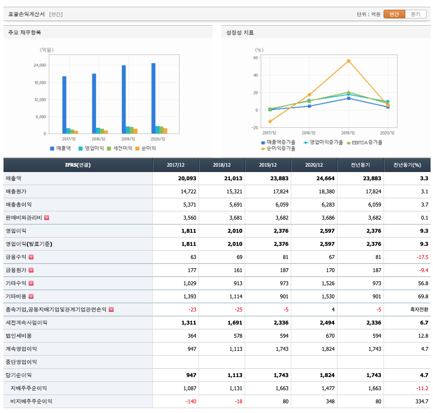 매출액 : 2017년 20093억원, 2018년 21013억원, 2019년 23883억원, 2020년 24664억원으로 증가하였습니다. 2020년은 전년동기대비 3.3% 증가하였습니다. 2020년 분기별로 보면 1분기 5290억원, 2분기 5455억원, 3분기 8076억원, 4분기 5842억원입니다.