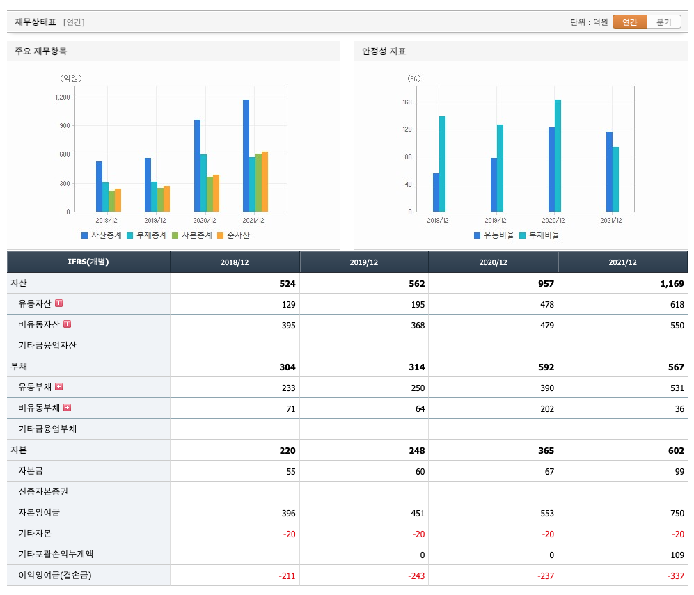 유보율 : 2019년 약 347%, 2020년 약 471%, 2021년 약 415%로 감소하고 있으며, 표준(100%)보다 낮아 부채비율이 안정적이지 않습니다.