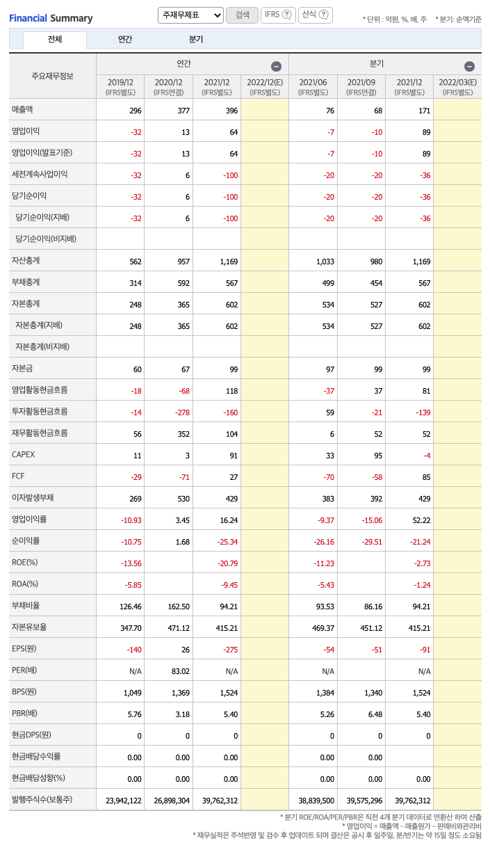 FCF(미래현금흐름) : 2019년 -29억원, 2020년 -71억원, 2021년 27억원으로 CAPEX가 좋습니다.