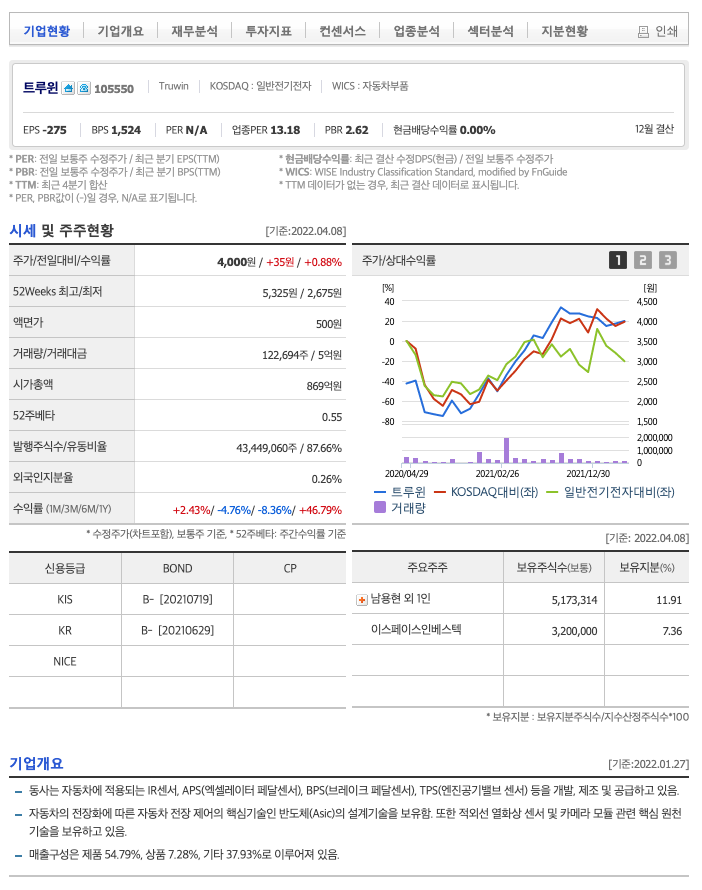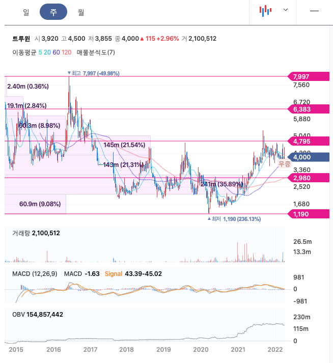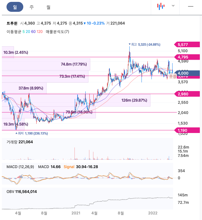 트루윈의 주가는 20년 11월 반등하여 21년 9월 최고 5325원을 찍고 보합중에 있습니다.
