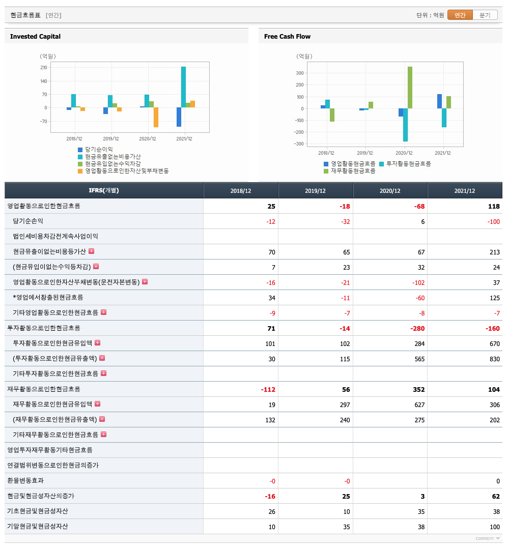 영업활동 현금흐름 : 2018년 25억원, 2019년 -18억원, 2020년 -68억원, 2021년 118억원으로 2018년과 2021년의 영업활동 현금흐름이 원활합니다.