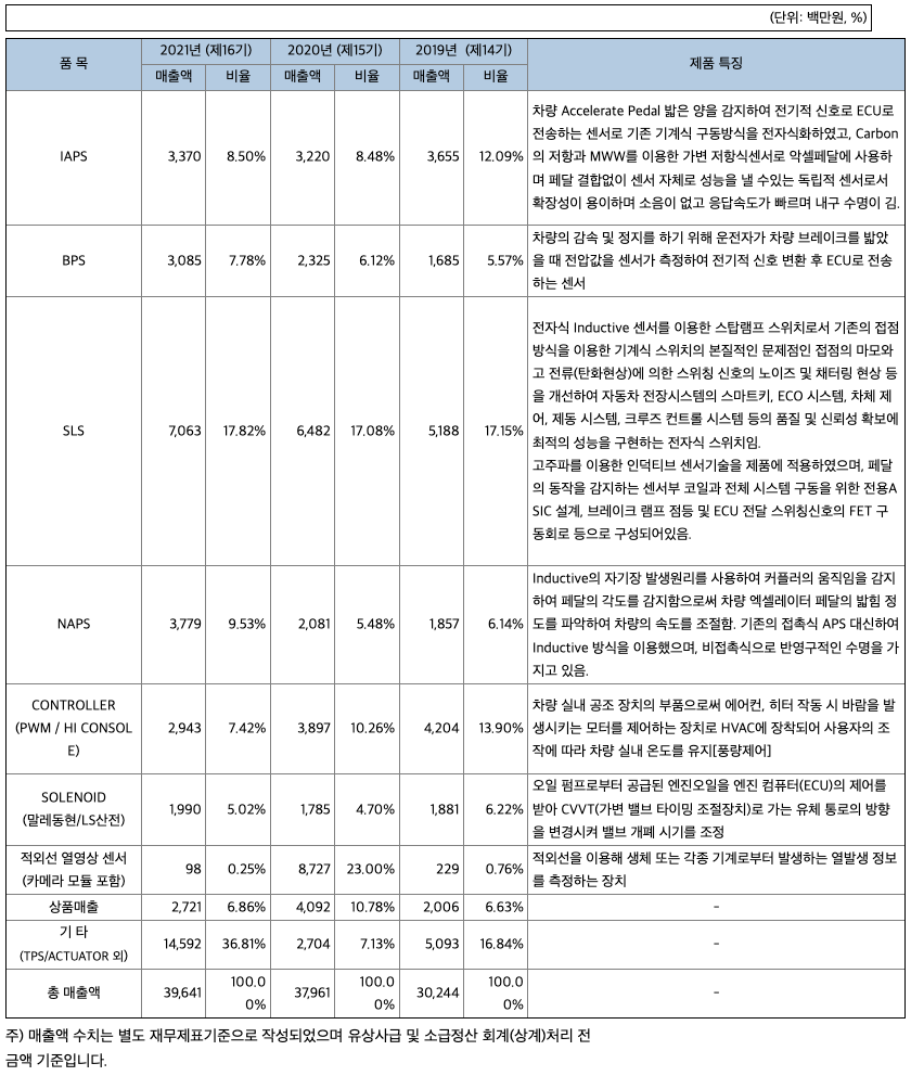 당사는 센서전문기업으로서 인쇄전자기술, 전자기응용기술, 열영상 적외선 기술 등을 보유하여 엑셀, 브레이크 페달 센서, 적외선 열영상 센서 및 모듈 등을 개발, 제조 및 공급하는 업체입니다. 자동차(자율주행차 및 친환경차 HEV/EV)에 적용되는 APS (Accelrator Pedal Sensor), BPS(Brake Pedal Sensor), SLS(Stop Lamp Switch)를 자동차 1차 Vendor를 고객으로 공급 중에 있으며, 적외선 열영상 센서 및 카메라의 수요시장 증가로 공급량이 빠르게 증가하고 있습니다. 주요 제품 등의 특성 및 기타 세부사항은 'Ⅱ.사업의 내용'의 2. 주요 제품 및 서비스를 참고하여 주시기 바랍니다.