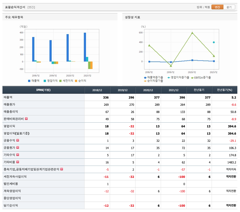 매출액 : 2018년 336억원, 2019년 296억원, 2020년 377억원, 2021년 396억원으로 전년동기대비 증가하였습니다. 2021년는 전년동기대비 5.2% 증가하였습니다. 2021년 분기별로 보면 1분기 82억원, 2분기 76억원, 3분기 153억원, 4분기 83억원입니다.