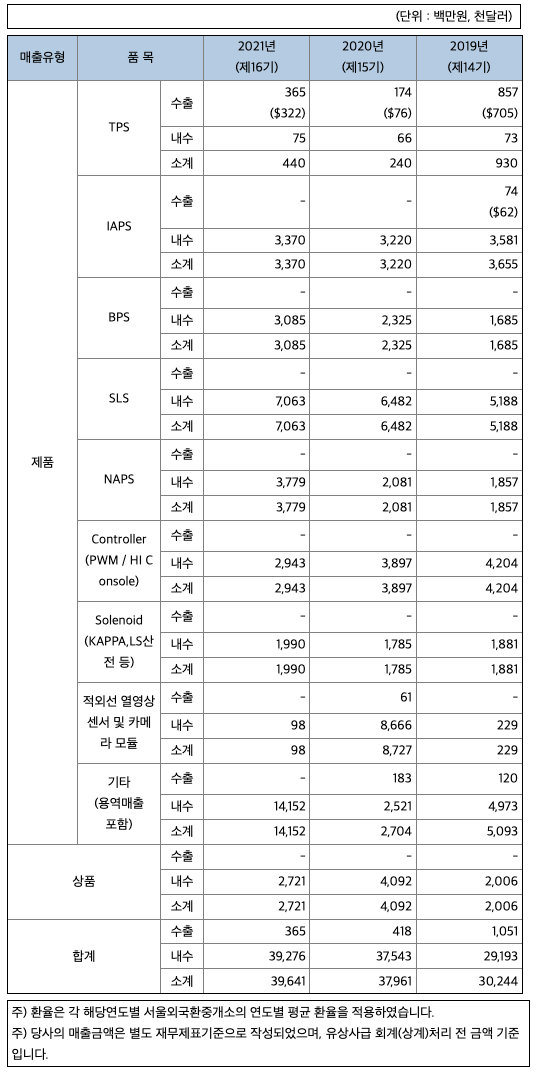 당기 영업상황으로 2021년 매출액은 377억 대비 약 5.3% 증가한 396.4억원(별도기준)을 시현하였으며 당사의 주력 매출 품목인 자동차용 센서는 당분기 자동차 시장의 전기차 및 친환경차량의 공급 증가로 인하여 당사 ITEM 중 BPS, SLS 등의 매출이 확대 되었습니다.