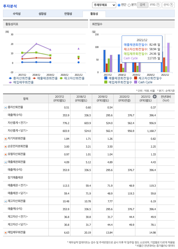 재고자산회전율(높을 수록 좋습니다) : 2019년 약 44억원, 2020년 약 49억원, 2021년 약 78억원이고, 회전율은 2019년 약 7%, 2021년 약 6%로 안정적입니다.