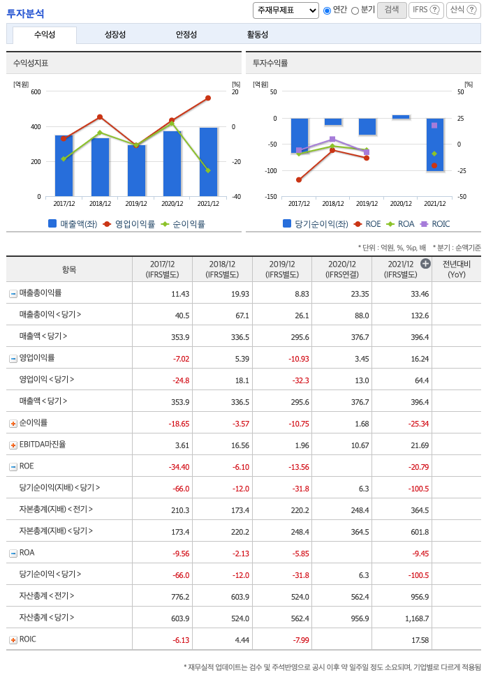 ROA(Return On Assets, 총자산순이익율, 경영자의 관점) : 2017년 약 -9%, 2018년 약 -2%, 2019년 약 -5%, 2021년 약 -9%이고, 자기자본순이익율은 이상율(10%)보다 낮습니다.