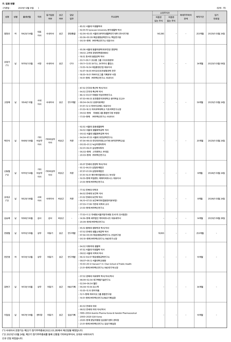 당사는 녹십자가 출연한 비영리 연구재단법인인 "목암생명과학연구소"의 소장인 문홍모 박사와 염정선 대표가 설립한 바이오 벤처기업으로 2000년 설립되었으며, 2011년 최대주주가 ㈜차바이오텍으로 변경되면서 차병원/차바이오그룹에 편입되었습니다. 설립자인 문홍모 박사는 B형 간염 백신개발에 선구자로 1세대 B형 간염 백신을 개발하였고 녹십자의 2세대 재조합 B형 간염 백신 개발에 큰 공헌을 하였으며, B형 간염 백신 연구를 확장하여 당사의 B형 간염 치료백신 개발을 주도하였습니다. 그리고 현 대표이사인 염정선 박사는 목암생명과학연구소에서 헬리코박터 파이로리 백신과 경구용 면역증강제 개발을 담당하여, 관련 특허를 다수 출원하였고, 많은 연구 성과를 가지고 있습니다. 이러한 연구 성과를 바탕으로 설립 당시의 핵심인력이 현재까지 20년 이상 당사의 신규 면역증강제 개발과 이를 활용한 백신 개발에 집중하고 있습니다.