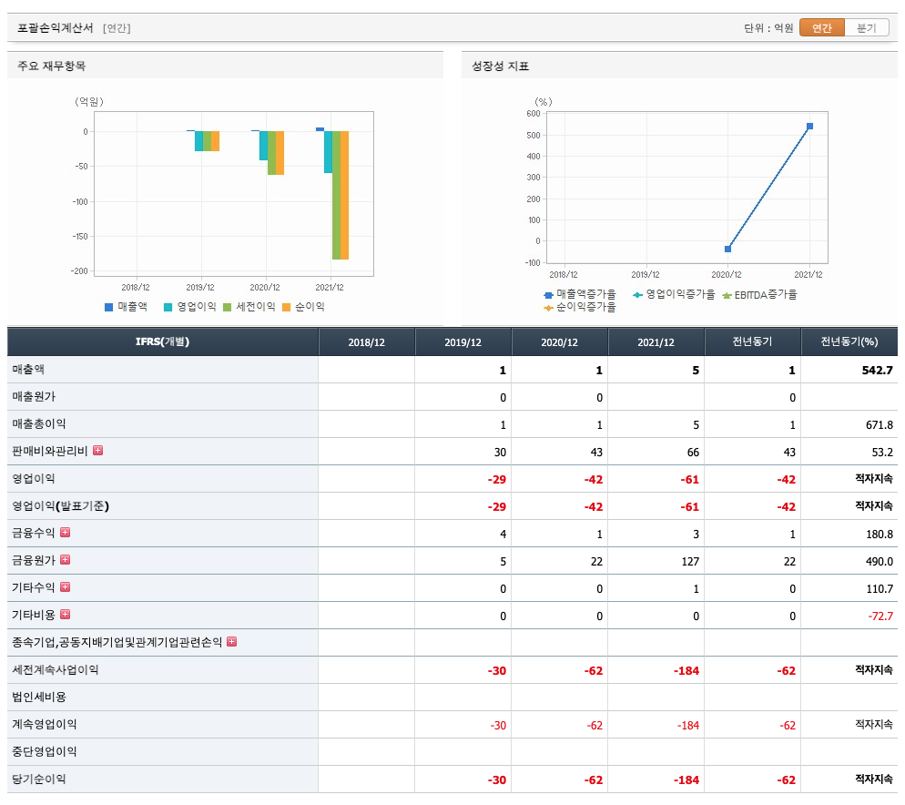 영업이익 : 2018년 -29억원, 2019년 -42억원, 2020년 -61억원, 2021년 -42억원으로 전년동기대비 적자지속하였습니다.